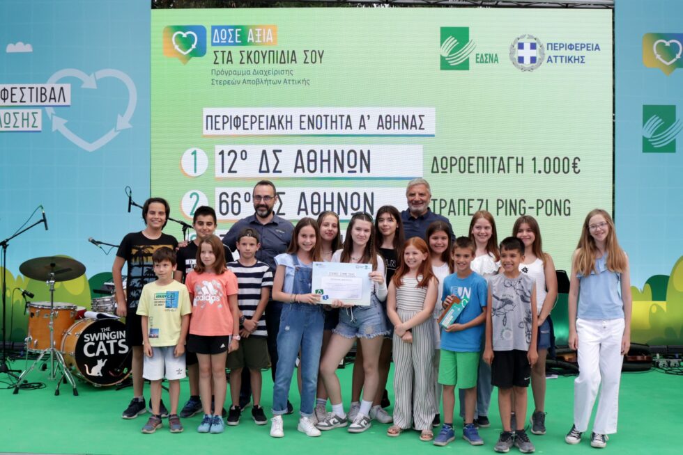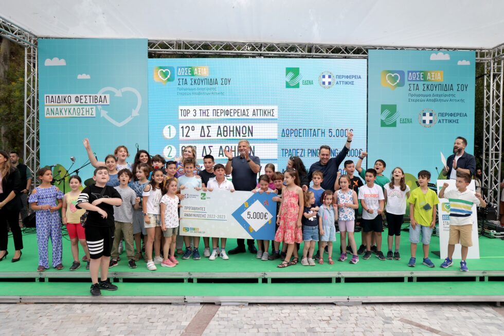 Συγκεκριμένα, σε μια μεγάλη γιορτή στο Πεδίον του Άρεως με τη συμμετοχή μαθητών, εκπαιδευτικών, γονιών και πλήθους πολιτών ολοκληρώθηκε το πρώτο πιλοτικό Σχολικό Πρωτάθλημα Ανακύκλωσης που διοργάνωσε η Περιφέρεια Αττικής σε συνεργασία με τον ΕΔΣΝΑ. Οι περίπου 20.000 μαθητές από τα 70 Δημοτικά Σχολεία της Αττικής σε διάστημα πέντε μηνών που διήρκεσε το πρόγραμμα συγκέντρωσαν συνολικά πάνω από 45,5 τόνους ανακυκλώσιμων υλικών, αποδεικνύοντας στην πράξη ότι η μεγάλη προσπάθεια που κάνει η Περιφέρεια Αττικής και ο ΕΔΣΝΑ για την ευαισθητοποίηση και κινητοποίηση των πολιτών προς ένα νέο μοντέλο διαχείρισης των απορριμμάτων φέρνει ουσιαστικά αποτελέσματα.