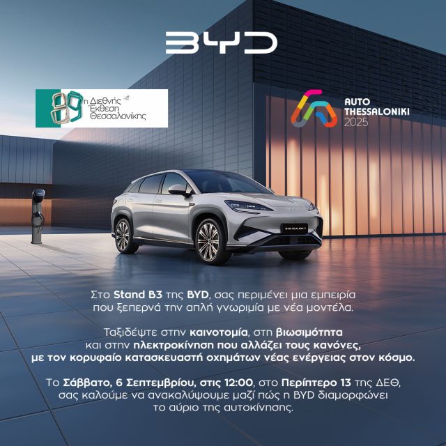 Του Γιάννη Χαλκιαδάκη. Ο κορυφαίος κατασκευαστής ηλεκτρικών και plug-in hybrid οχημάτων στον κόσμο και Νο1 σε πωλήσεις ηλεκτρικών οχημάτων στην Ελλάδα (Ιανουάριος – Ιούλιος 2025), η BYD, δίνει δυναμικό «παρών» στην έκθεση AUTO THESSALONIKI, στο πλαίσιο της 89ης Διεθνούς Έκθεσης Θεσσαλονίκης (6 – 14 Σεπτεμβρίου). Οι επισκέπτες θα έχουν την ευκαιρία να γνωρίσουν από κοντά και να ενημερωθούν για τη γκάμα της BYD, σε έναν χώρο σύγχρονης αισθητικής και υψηλής τεχνολογίας, στο Περίπτερο 13, stand B3.