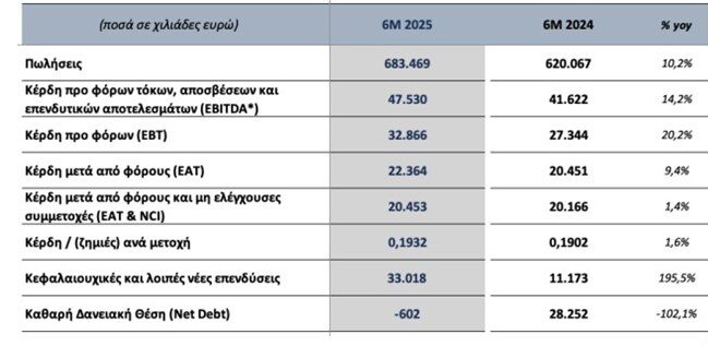 Ειδικότερα, σε σύγκριση με το αντίστοιχο εξάμηνο του 2024, οι πωλήσεις σημείωσαν αύξηση 10,2%, η λειτουργική κερδοφορία (EBITDA) 14,2%, τα κέρδη προ φόρων (ΕΒΤ) 20,2% και τα καθαρά κέρδη μετά από φόρους (ΕAΤ) 9,4%. Σημειώνεται ότι τα μεγέθη του Α’ εξαμήνου 2025 περιλαμβάνουν και την εταιρεία Μπενρουμπή η οποία ενσωματώθηκε στον όμιλο την 1η Φεβρουαρίου 2025