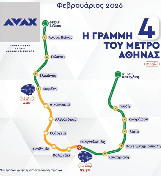 Του Γιάννη Χαλκιαδάκη. Σήραγγα 5,1 χιλιομέτρων, έχει κατασκευάσει η “Αθηνά”, ο ένας από τους δύο μετροπόντικες που κατασκευάζει τη Γραμμή 4 του Μετρό της Αθήνας, που ξεκίνησε από την Κατεχάκη, με τη κεφαλή της να αναμένεται τις επόμενες μέρες να αποκαλυφθεί στο φρέαρ του Ευαγγελισμού, στη συμβολή των οδών Βασιλέως Κωνσταντίνου και Μιχαλακοπούλου.